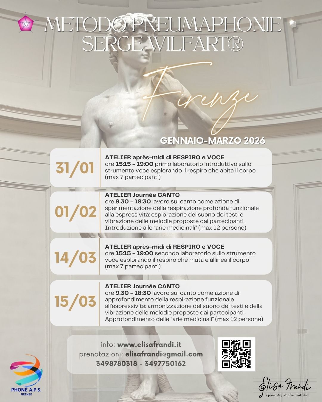 - 14 marzo 2026 ore 15:15 – 19:00 secondo Atelier di approfondimento dello strumento-voce esplorando il respiro che muta e allinea il corpo (max 7 partecipanti)
