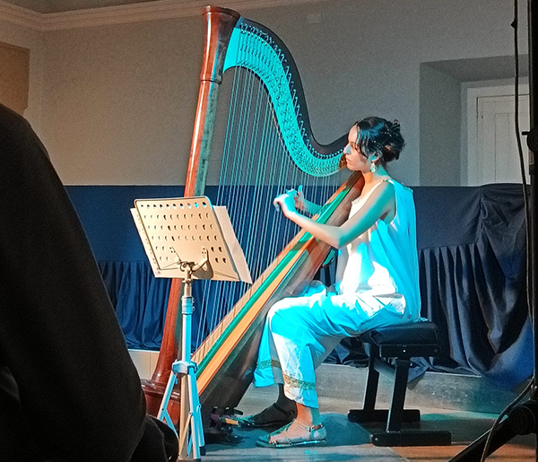 Jasmine ha arricchito la pièce con momenti musicali di grande intensità, creando un tessuto sonoro capace di esaltare le emozioni e i significati del testo teatrale. Le delicate armonie dell’arpa hanno accompagnato lo sviluppo drammaturgico, amplificando il legame tra parola e sentimento.
